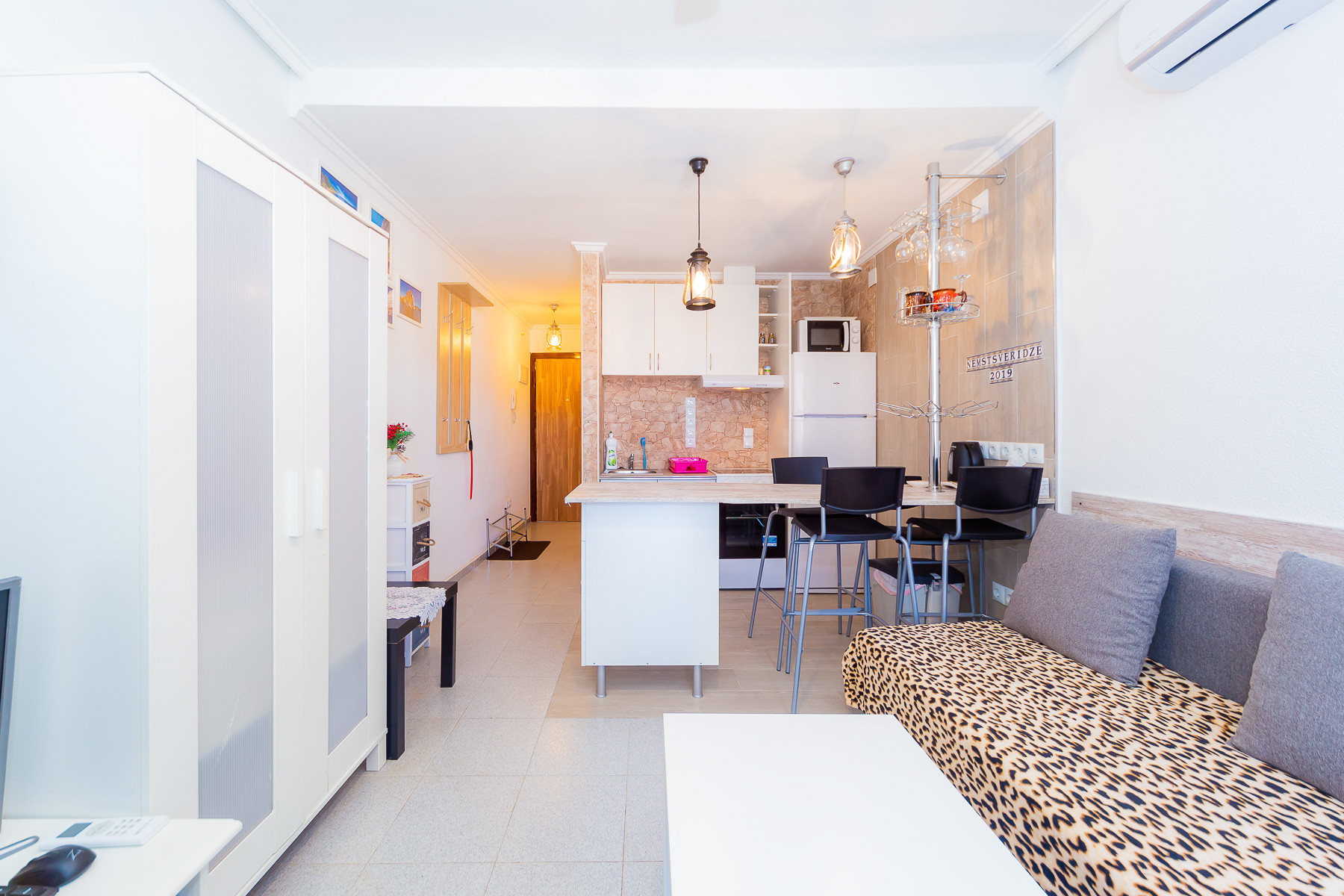 Bonito estudio de 26 m2 después de la reparación completa en el centro de la ciudad. El estudio está diseñado para dos personas. El estudio consta de un salon con una cocina, un baño y una terraza acristalada. Hay todo lo necesario para residir tranquilamente: muebles, electrodomésticos, vajilla, ropa de cama y toallas. Hay aire acondicionado. Hay TV Española y Wi-Fi. La zona está bien desarrollada: bares y restaurantes, supermercados "Consum" y "Mercadona" a un paso. La playa, a unos 10-12 minutos a pie. En el estudio, no se puede fumar y tampoco se aceptan mascotas.