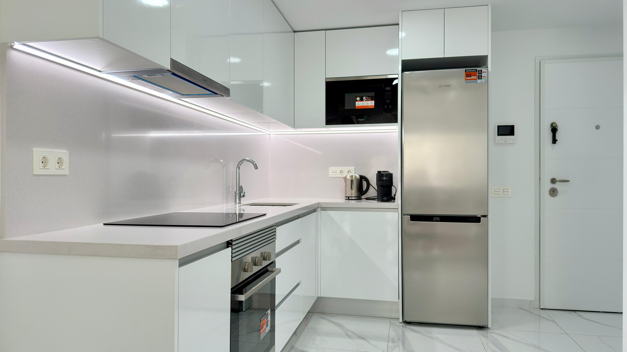 La cocina, está equipada con nevera, microondas, horno, utensilios/cocina y cafetera.