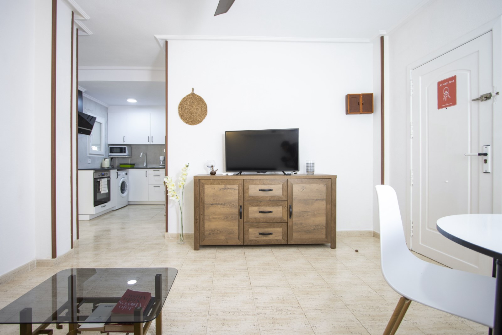 Se alquila un apartamento luminoso de un dormitorio en el centro de la ciudad. El apartamento de 35 m2 consta de una sala de estar, dormitorio, cocina de estilo americano, baño y un balcón. Hay todo lo necesario para la vida y el descanso: muebles, electrodomésticos, vajilla, ropa de cama y toallas. El salón está equipado con aire acondicionado. Televisión es española. En el balcón hay muebles de verano. El supermercado "Consum" a 150 metros, "Mercadona" – 250 metros. Los bares, cafeterías y restaurantes más cercanos están a menos de 50 metros. La estación de autobuses a unos 260 metros. La playa Del Cura se encuentra a unos 700 metros (unos 10 minutos a pie). Para un máximo de 4 personas. (¡no se admiten animales!). Solo se permite fumar en el balcón!