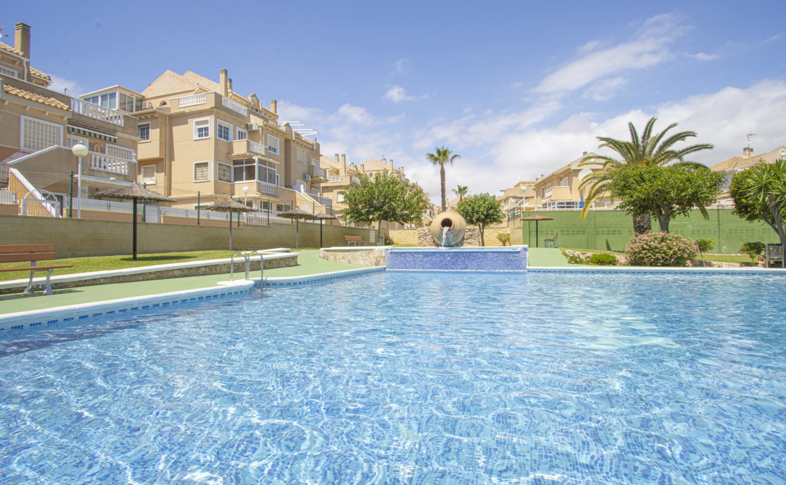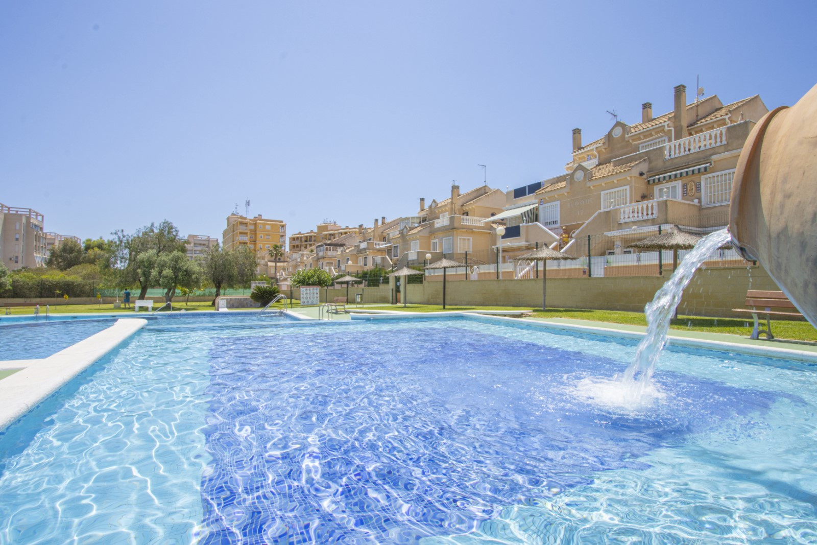 We offer a bungalow for rent in an urbanisation with a swimming pool in the Aguas Nuevas area near La Mata. The 42 m2 apartment consists of a living room, two bedrooms, a separate kitchen, a bathroom and a glazed terrace. The apartment is fully equipped for living and relaxation: furniture, appliances (including a coffee maker), kitchenware, bed linen and towels. Spanish television. The living room has air conditioning. The area has well-developed infrastructure. The Mercadona supermarket is about 350 metres away. Bars and cafes are located in the same area. The sea is approximately 1 km away, and La Mata beach is about 1.5 km away. Accommodation option is up to 4 people (no pets). Smoking indoors is strictly prohibited! Rental of a baby cot and high chair costs 20 euros for the entire stay period.