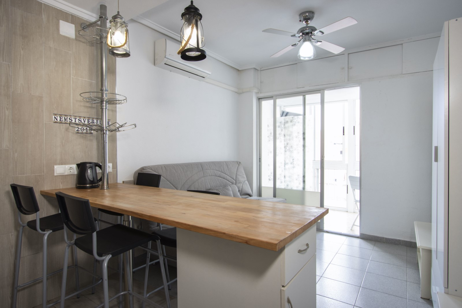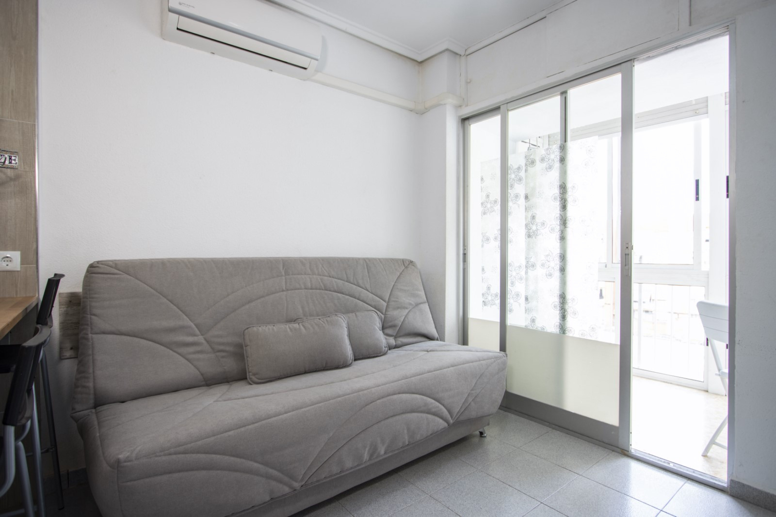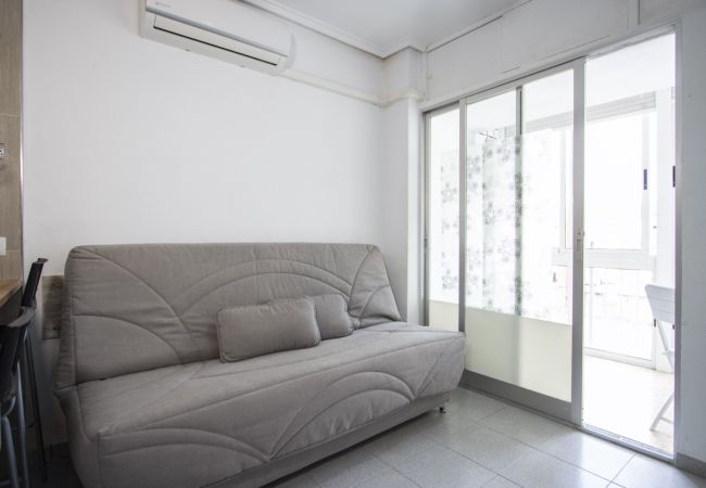 For rent studio spread out over 26 m2. It can sleep up to two people. The studio consists of a salon, kitchen, bathroom and a glazed terrace. It is equipped with furniture, appliances, dishes, bedding and towels. There is air conditioning. Spanish TV is available. There are many tapas bars and restaurants, supermarkets and more local amenities all in walking distance. The blue flag beach of Del Cura beach is a 10 minute walk. Pets and smoking is not allowed in the property. There is no English television but almost all the shows and movies on Spanish channels can be seen in the original version (English).
