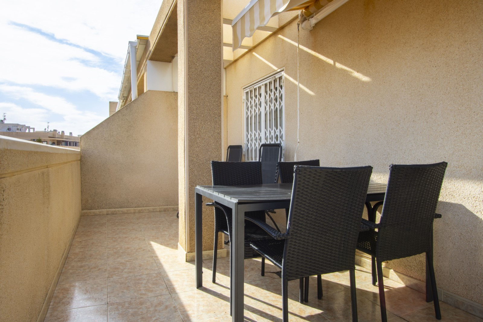 A spacious and cosy penthouse with a large terrace in the centre of Torrevieja is available for rent! The 65 m2 apartment consists of a spacious living room, two bedrooms, an American-style kitchen, a bathroom and a large terrace that can be used as a solarium and a place for the whole family to relax at the dining or evening table. The apartment is designed to accommodate up to 5 people. Everything necessary for living and relaxation is available: furniture, bedding, kitchenware, household appliances, fan, Spanish television, air conditioning. The area has excellent infrastructure. Restaurants, bars, shops, pharmacy, one of the most popular supermarkets in Spain - "Mercadona" are within walking distance. The bus station is located next to it. The sea and the popular city beach Del Kura are only 200 metres away!