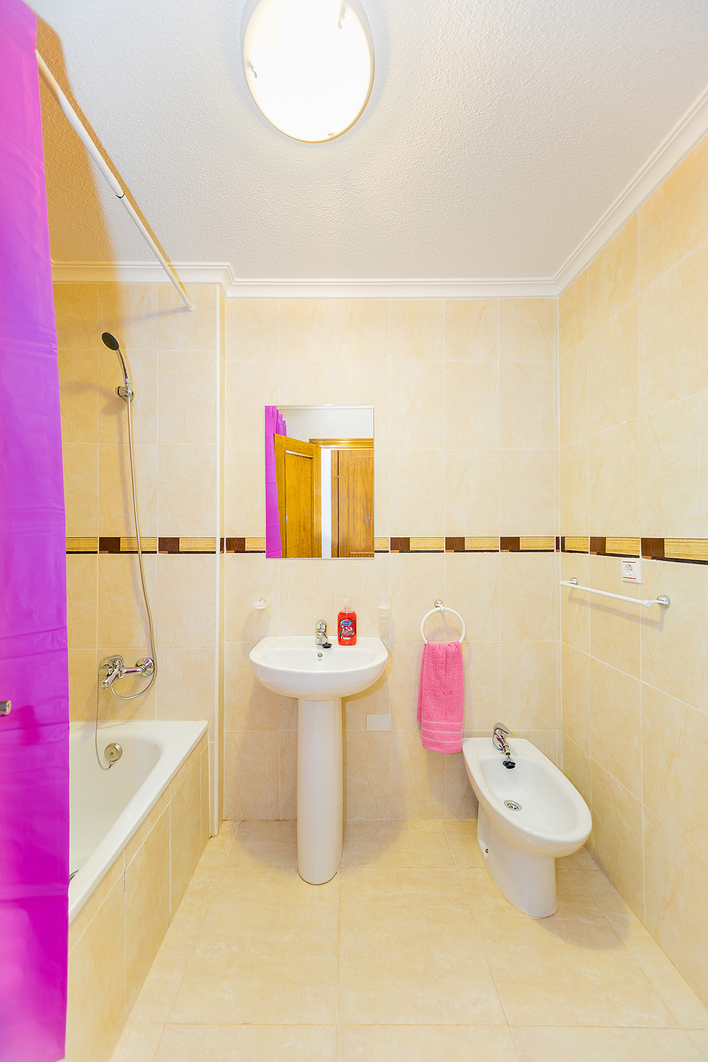 This bungalow is located in the urbanization of "Dream Hills", in the popular Los Altos, Orihuela Costa. It is set out over 75 m2 and consists of two bedrooms, living room, two bathrooms (one with bath, the second with shower), independent kitchen, from which you have access to a large patio. In front of the bungalow there is a large garden area. It is equipped with furniture, appliances, dishes, bed linen and towels. Spanish Television is also available. Both bedrooms have air conditioning, in the salon there is a ceiling fan. Both bedrooms have fitted wardrobes. There is a communal swimming pool and green area. Nearby there is also a children’s playground. It can sleep up to 6 people. No pets are allowed and smoking is only allowed outside the house. The area is very popular and the new ALDI supermarket is about 750 meters away. The blue flag beach of Playa Flamenca, La Zenia and Campoamor are all a short drive away. There are many bars and restaurants in walking distance and the Zenia Boulevard shopping complex with its array of shops bars and much more is a 5 min drive away.