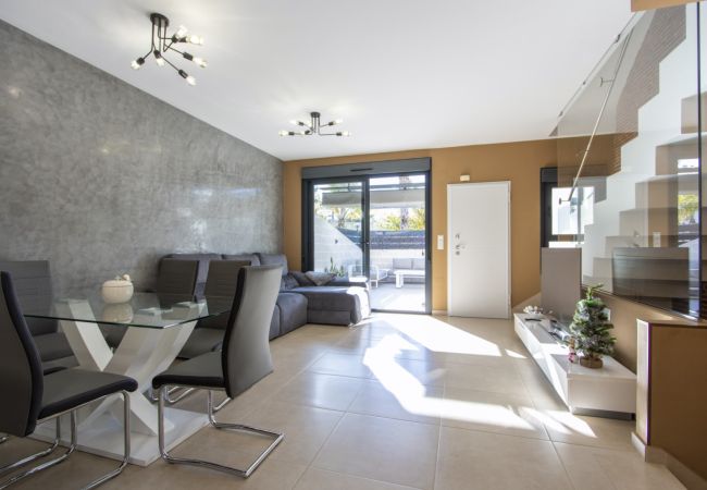 A newly built villa is offered for winter rental in a closed urbanization in the Villamartin area (Orihuela Costa). The spacious villa consists of a living room, 3 bedrooms, an American-style kitchen, 3 bathrooms, a terrace, and a private solarium. The urbanization has 2 common pools (one with heating), a children's playground, and a beautiful green area. The villa is fully furnished with all household appliances. The solarium has a cozy area with a barbecue for pleasant relaxation. The area has developed infrastructure, with the La Zenia shopping center located approximately 2.5 km away. Spanish television and wireless internet are available. Accommodation option for 7 people (no pets). Smoking is only allowed in open areas.