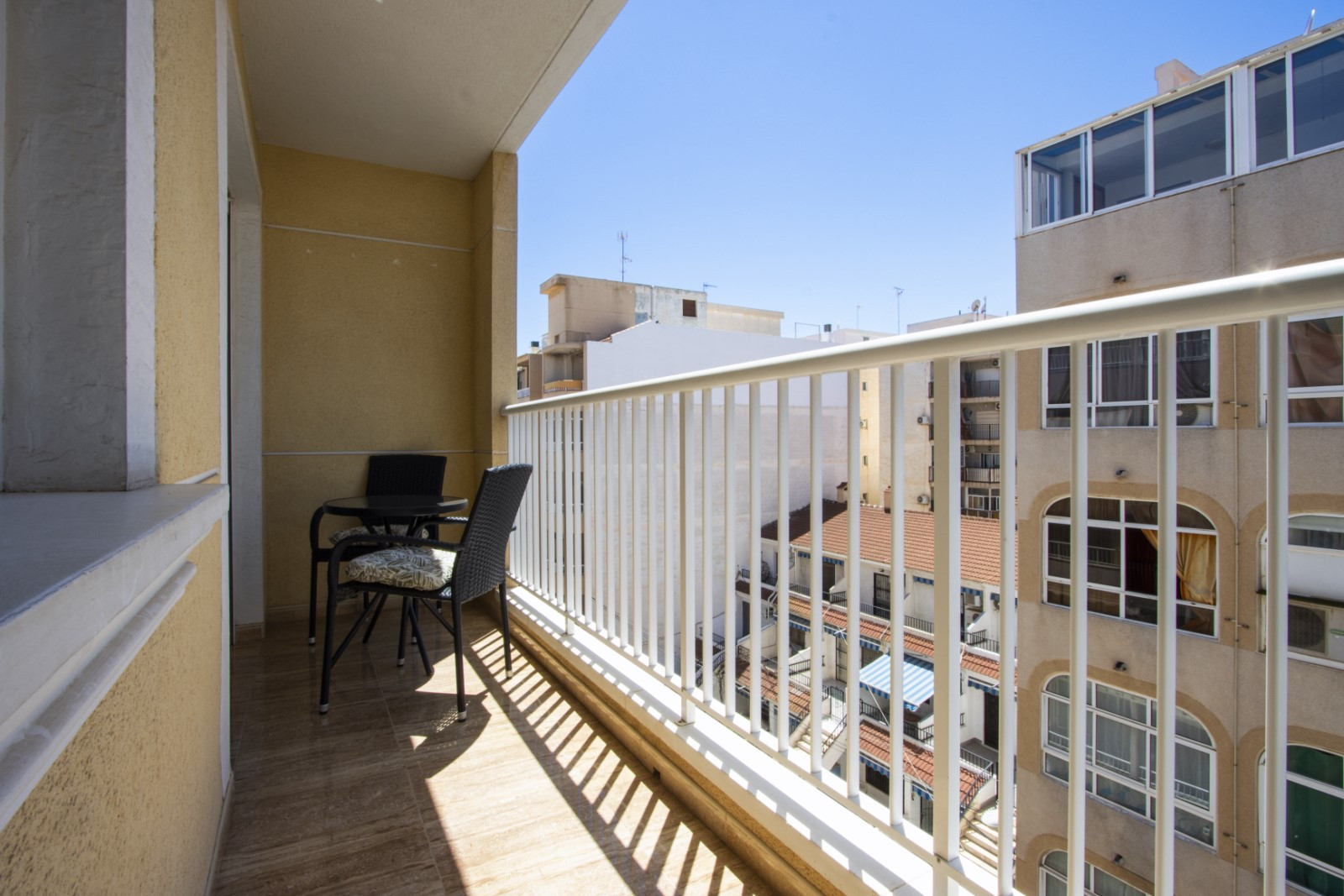 We offer apartments for tourist rent in the Torreblanca urbanization in La Mata, the best beach area in Torrevieja. The 40 m2 apartment consists of a living room, one bedroom, a French-style kitchen, a bathroom, a glazed balcony and a private patio with outdoor furniture. The apartment has everything you need for living and relaxing: furniture, household appliances, dishes, bed linen and towels. The cabin is air conditioned. Spanish TV, wireless Internet. Attention! You have to go up stairs to the apartment! The sea and the beach are about 700 meters away. The area has a well-developed infrastructure. Mercadona supermarket is 350 metres away. The nearest bars are just 200 metres away. Accommodation option — up to 3 people (no pets!). Smoking is strictly prohibited in the apartments!