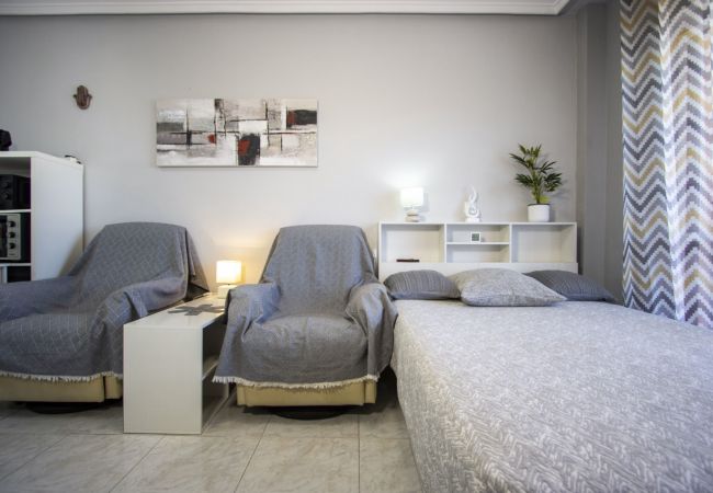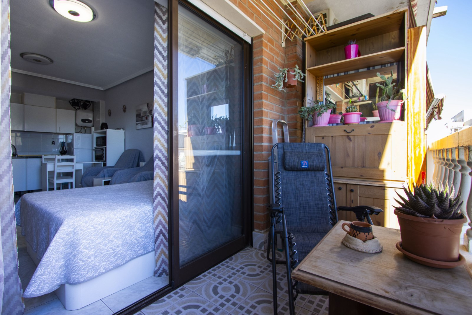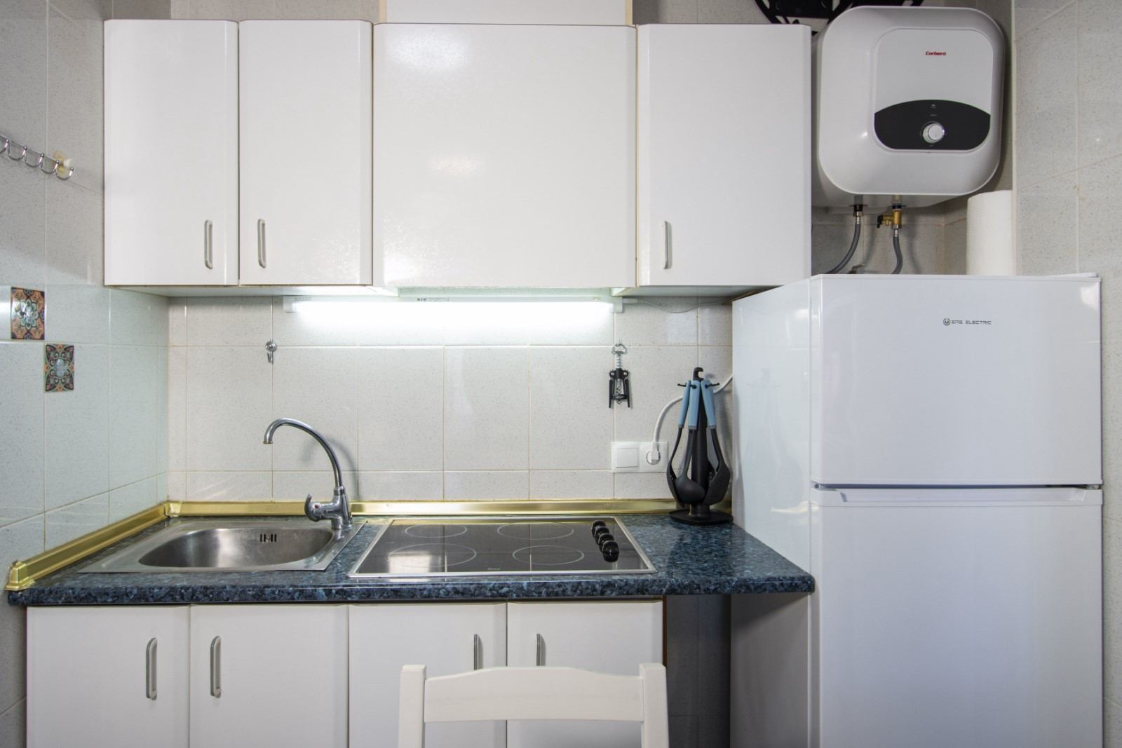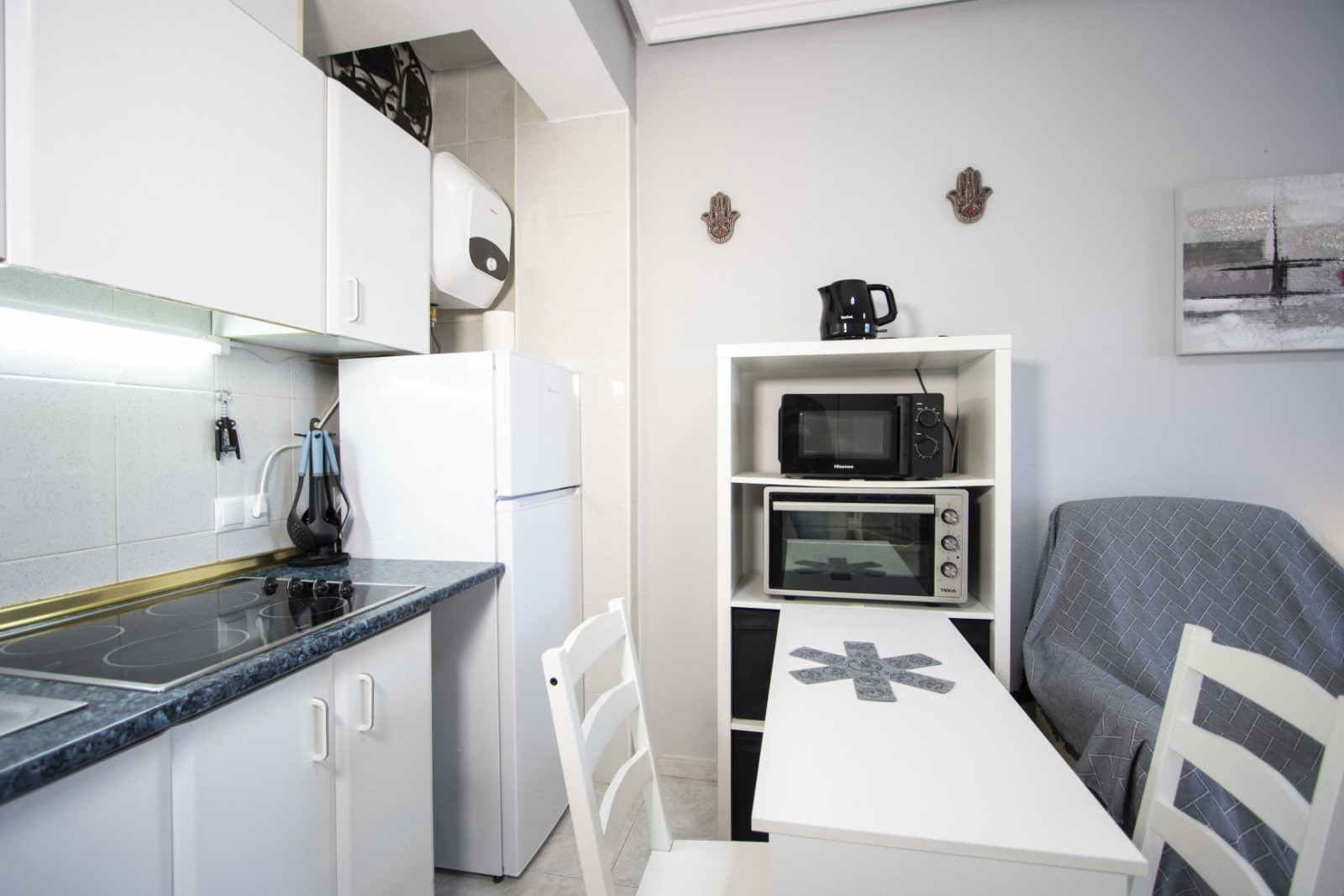 For rent studio spread out over 26 m2. It can sleep up to two people. The studio consists of a salon, kitchen, bathroom and a glazed terrace. It is equipped with furniture, appliances, dishes, bedding and towels. There is air conditioning. Spanish TV is available. There are many tapas bars and restaurants, supermarkets and more local amenities all in walking distance. The blue flag beach of Del Cura beach is a 10 minute walk. Pets and smoking is not allowed in the property. There is no English television but almost all the shows and movies on Spanish channels can be seen in the original version (English).