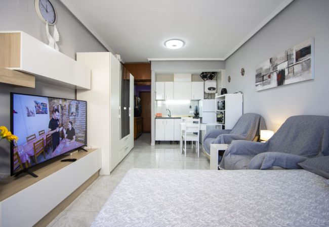 Studio for rent in very popular area. It is spread out over 27 m2 and consists of a salon, a bathroom and a glazed terrace. It sleeps up to 2 people. No pets are allowed. It is equipped with furniture, appliances, air conditioning, bed linen and towels. Russian and Spanish TV is also available. Nearby are many cafes, tapas bars, supermarket and much more local ammeneties. It is less than a 10 min walk to the blue flag beaches of Del Cura and Los Locos. Smoking is prohibited in the apartment.There is no English television but almost all the shows and movies on Spanish channels can be seen in the original version (English).