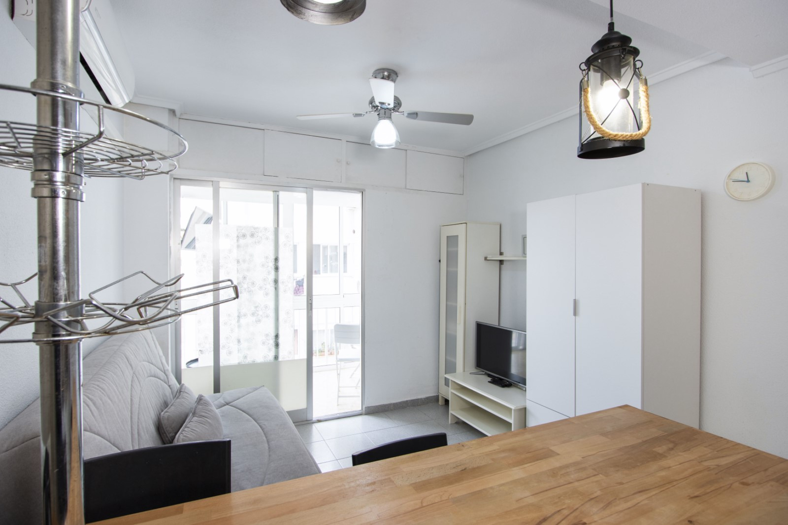For rent studio spread out over 26 m2. It can sleep up to two people. The studio consists of a salon, kitchen, bathroom and a glazed terrace. It is equipped with furniture, appliances, dishes, bedding and towels. There is air conditioning. Spanish TV is available. There are many tapas bars and restaurants, supermarkets and more local amenities all in walking distance. The blue flag beach of Del Cura beach is a 10 minute walk. Pets and smoking is not allowed in the property. There is no English television but almost all the shows and movies on Spanish channels can be seen in the original version (English).