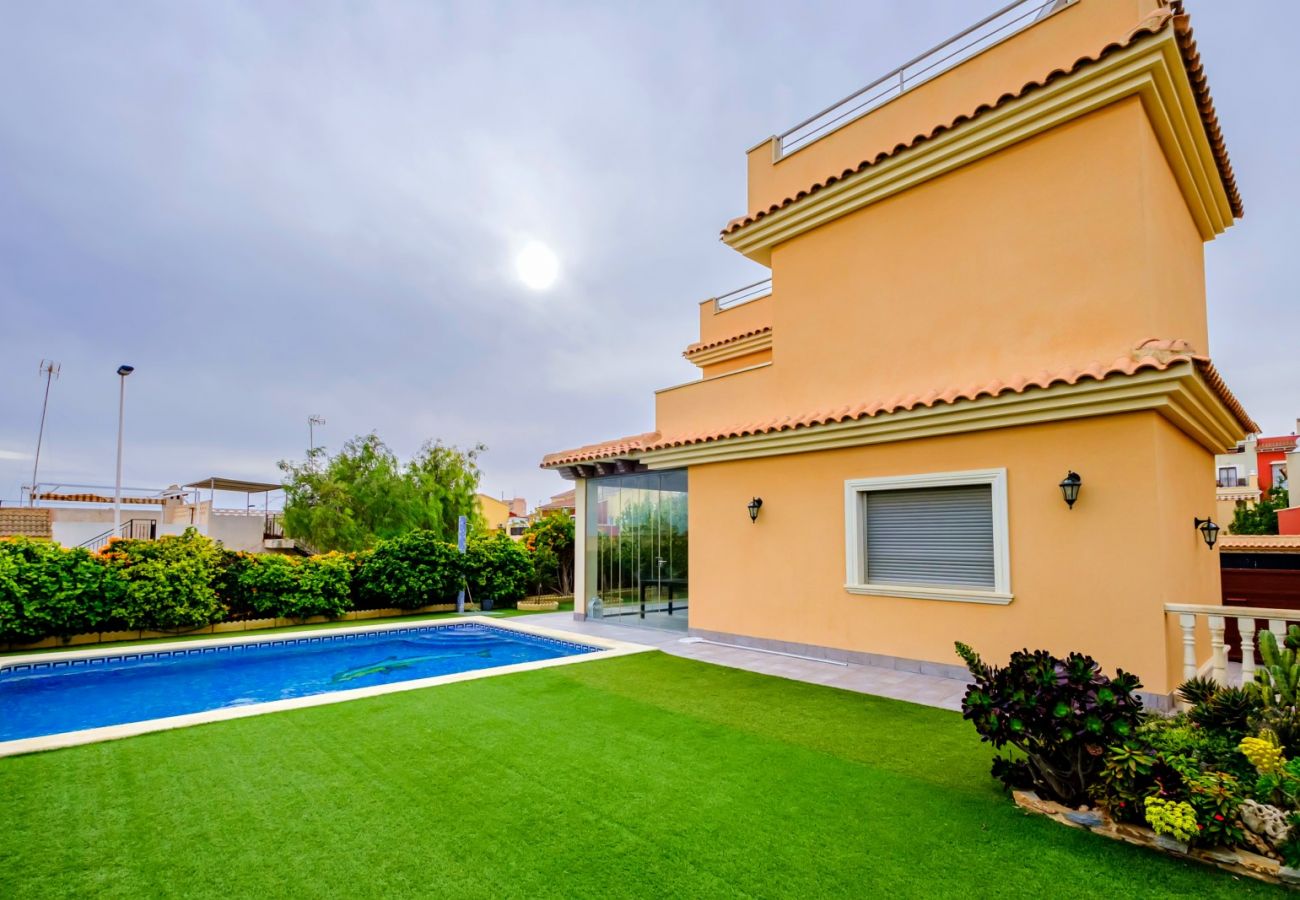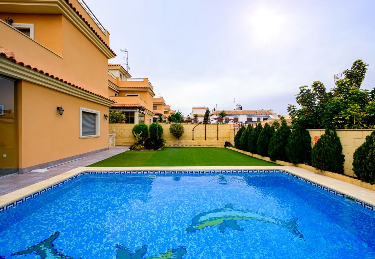 We offer for tourist rent a two-storey villa with a swimming pool and a large green area 400 meters from the sea. The villa consists of two salons, three bedrooms, a separate kitchen, three bathrooms, a glazed terrace, a balcony, two solariums. The house has everything you need for living and recreation: furniture, household appliances (including a coffee maker), dishes, linens and towels. Central air conditioning, Spanish TV, wireless internet. The area has a well-developed infrastructure: 200 meters away is the supermarket "Consum", the nearest cafe is 50 meters away. The sea is 400 meters away, but Los Locos beach itself is about 650 meters away. Accommodation option - up to 7 people (no animals!). Smoking is allowed only in open areas!