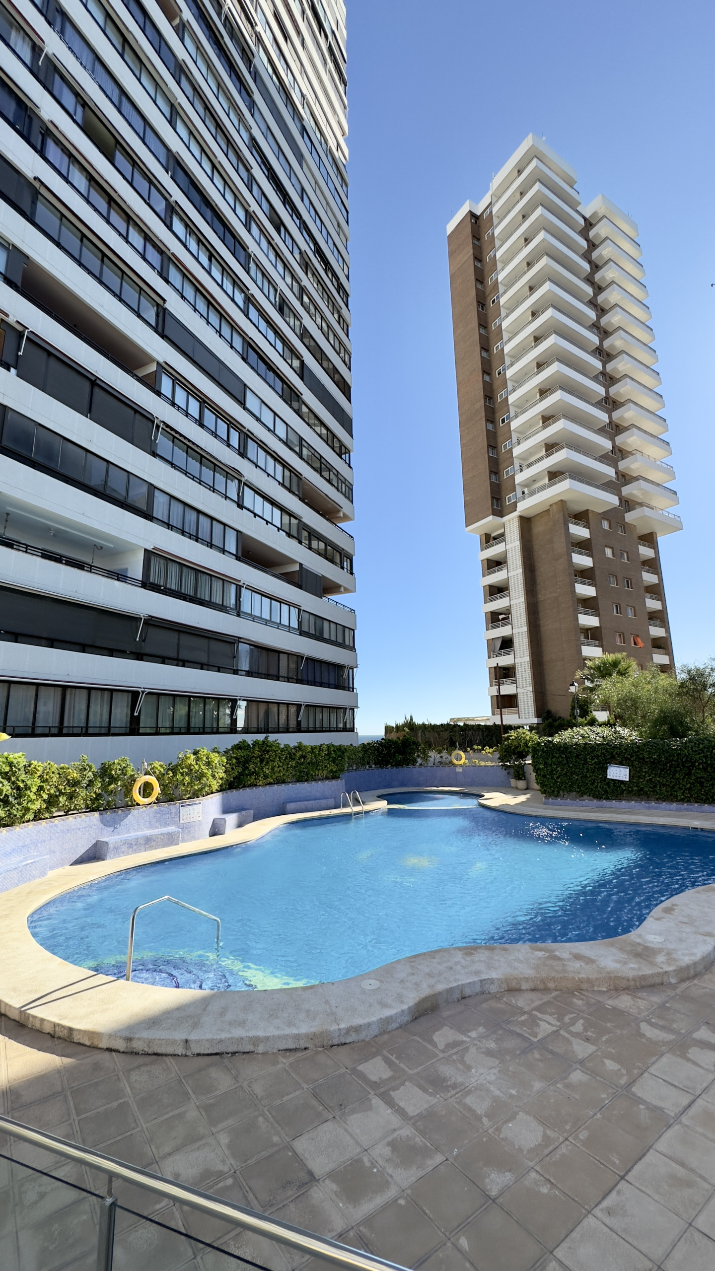 В квартире есть общий бассейн и частная парковка. Пешком можно добраться до пляжа, магазинов и главной набережной Бенидорма.