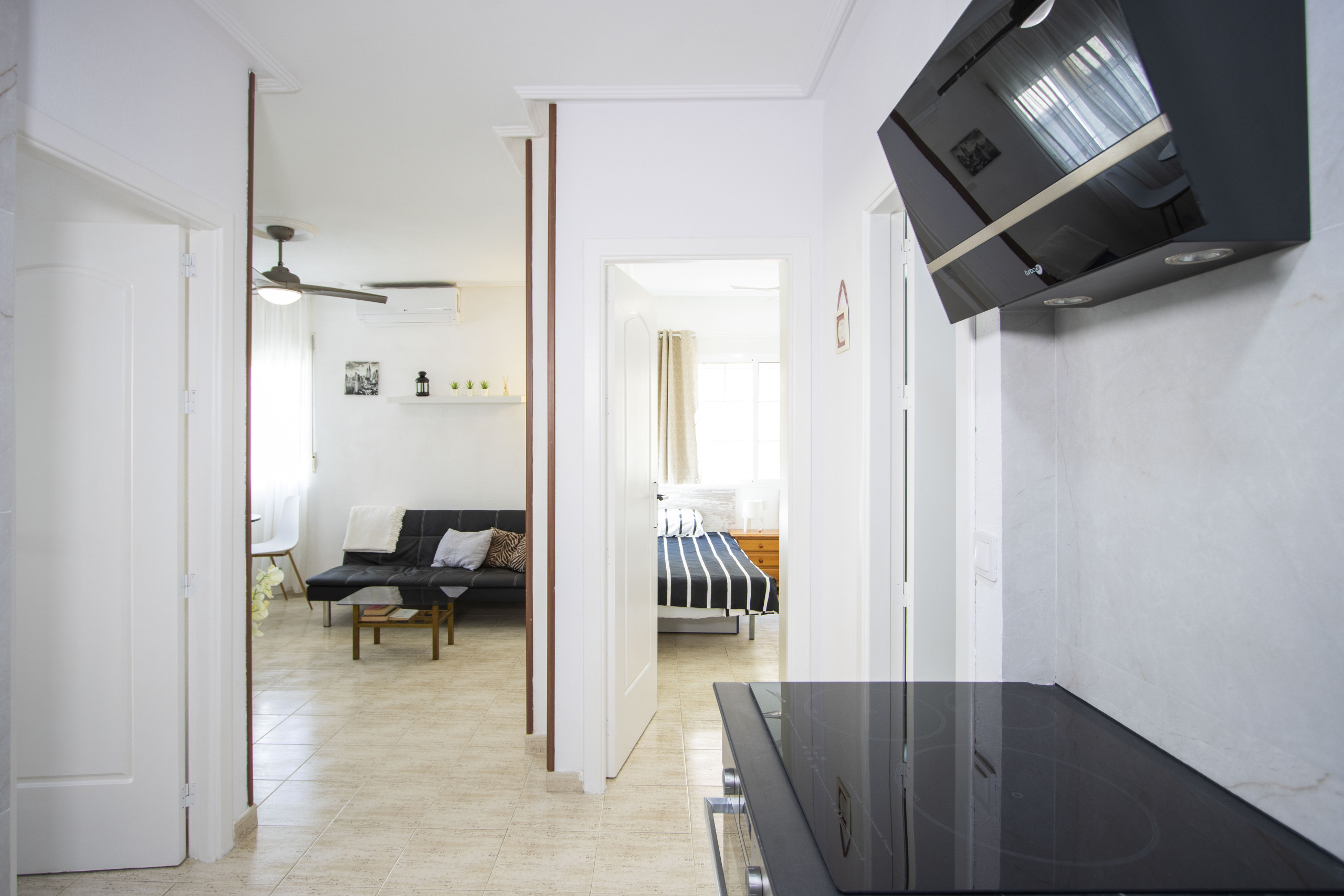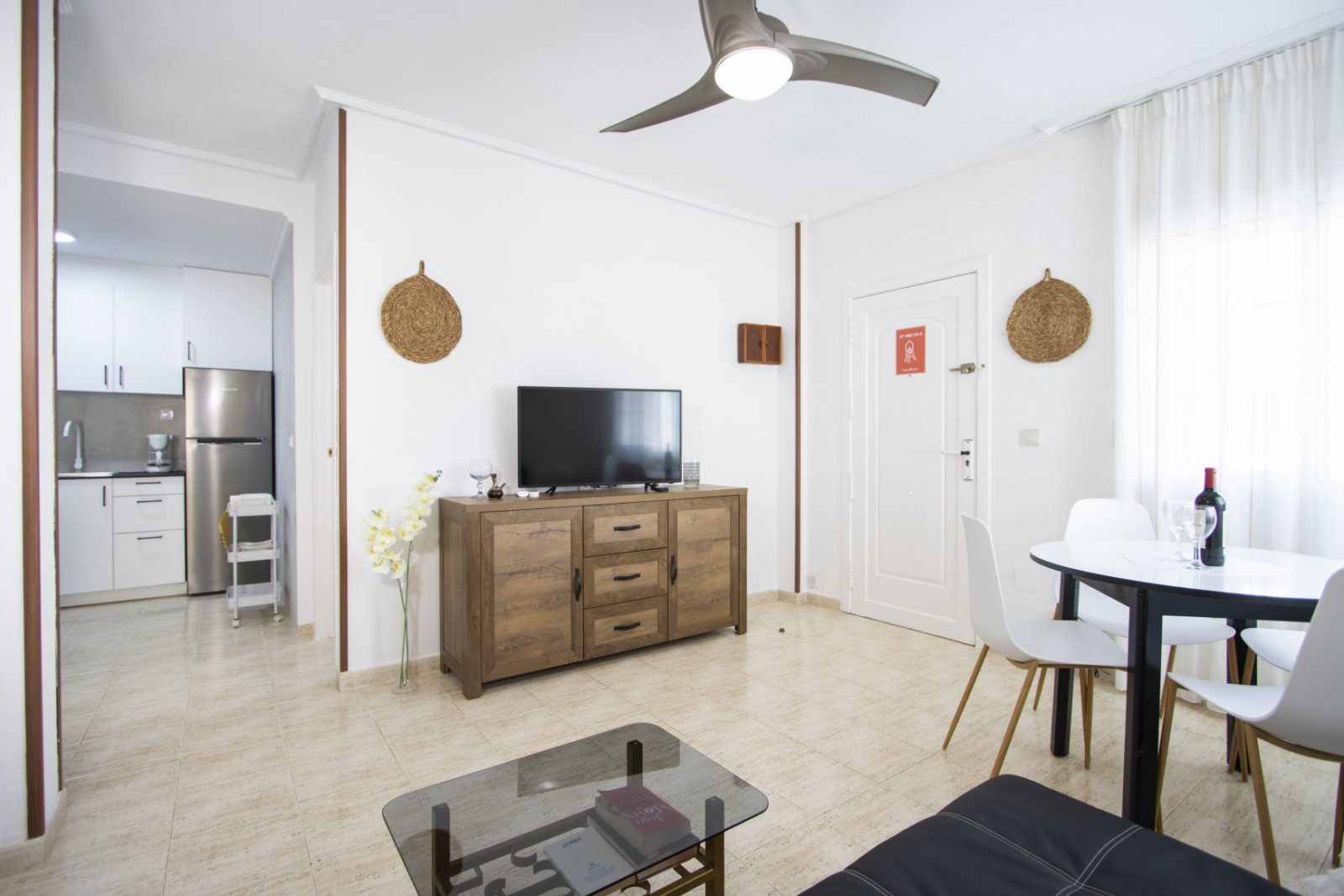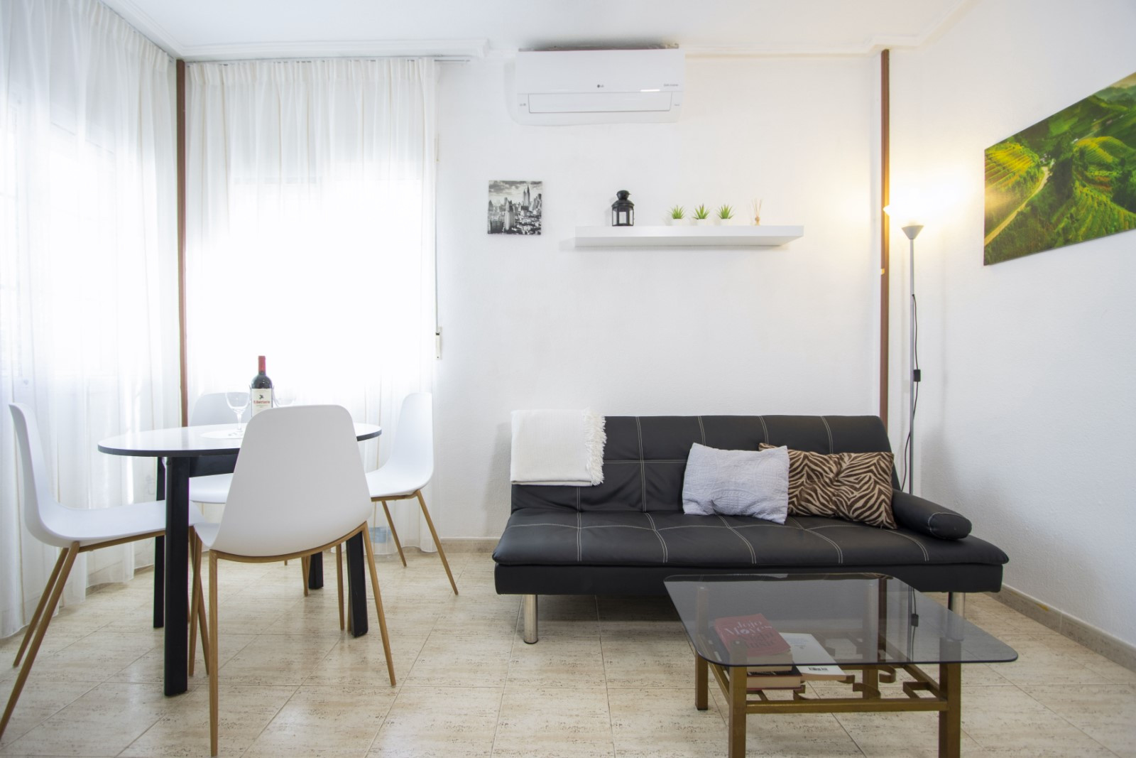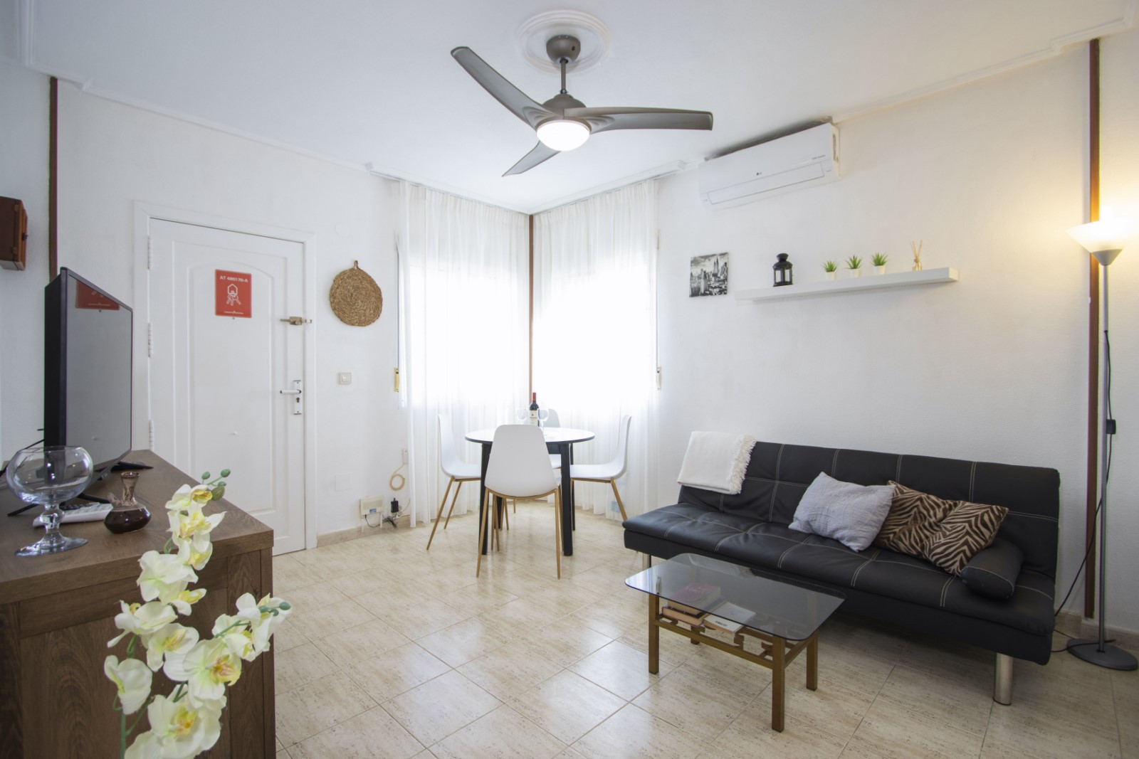 Предлагаем в туристическую аренду уютную светлую квартиру с одной спальней в шаговой доступности от моря и пляжа! Апартаменты площадью 39 м2 состоят из салона, 1 спальни, кухни американского типа, санузла и балкона. В квартире имеется все необходимое для проживания и отдыха: мебель, бытовые электроприборы (включая кофеварку), посуда, постельное белье и полотенца. На балконе есть летняя мебель. В зале установлен кондиционер . Телевидение испанское, беспроводной Интернет. В районе прекрасно развита инфраструктура: супермаркет «Консум» и русский магазин «Калинка» находятся в 250 метрах. В пешей доступности множество баров и ресторанов. До моря и популярного городского пляжа Дель Кура всего 150 метров! Вариант размещения – до 4 человек (без животных!). Курение допускается только на балконе!
