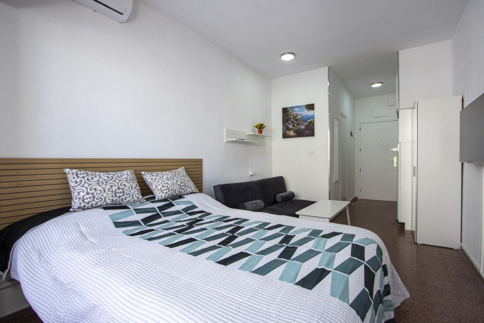 Сдается в туристическую аренду студия в районе с развитой инфраструктурой! Площадь студии 23 м2, состоит из салона, ванной комнаты и кухни. Рассчитана на проживание 2 человек (без животных!). Имеется все необходимое для проживания и отдыха: мебель, бытовые электроприборы (включая кофеварку), посуда, постельное белье и полотенца. Установлен кондиционер. Телевидение испанское, беспроводной Интернет. Есть парковочное место в подземном гараже. В районе хорошо развита инфраструктура. Рядом много кафе и баров, на соседней улице супермаркет "Консум", недалеко аптека и остановка городского транспорта. До моря и двух городских пляжей Лос Локос и Дель Кура 350 и 600 метров соответственно! Курение в квартире строго запрещено! Штраф за нарушение 200 евро!
