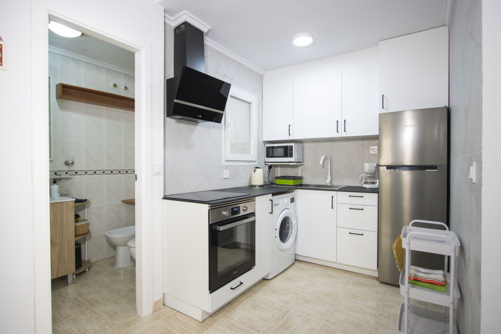 Предлагаем в аренду бунгало в урбанизации с бассейном в районе Aguas Nuevas недалеко от Ла Маты. Апартаменты площадью 42 м2 состоят из салона, двух спален, отдельной кухни, ванной комнаты и застекленной террасы. В апартаментах имеется все необходимое для проживания и отдыха: мебель, бытовая техника (включая кофеварку), посуда, постельное белье и полотенца. Телевидение испанское. В салоне установлен кондиционер. В районе хорошо развита инфраструктура. До сетевого супермаркета «Меркадона» около 350 метров. Там же располагаются бары и кафе. До моря примерно 1 км, до пляжа Ла Мата около 1,5 км. Вариант размещения – до 4-х человек (без животных). Курение в помещении строго запрещено! Аренда детской кроватки и стульчика для кормления стоит 20 евро за весь период проживания.